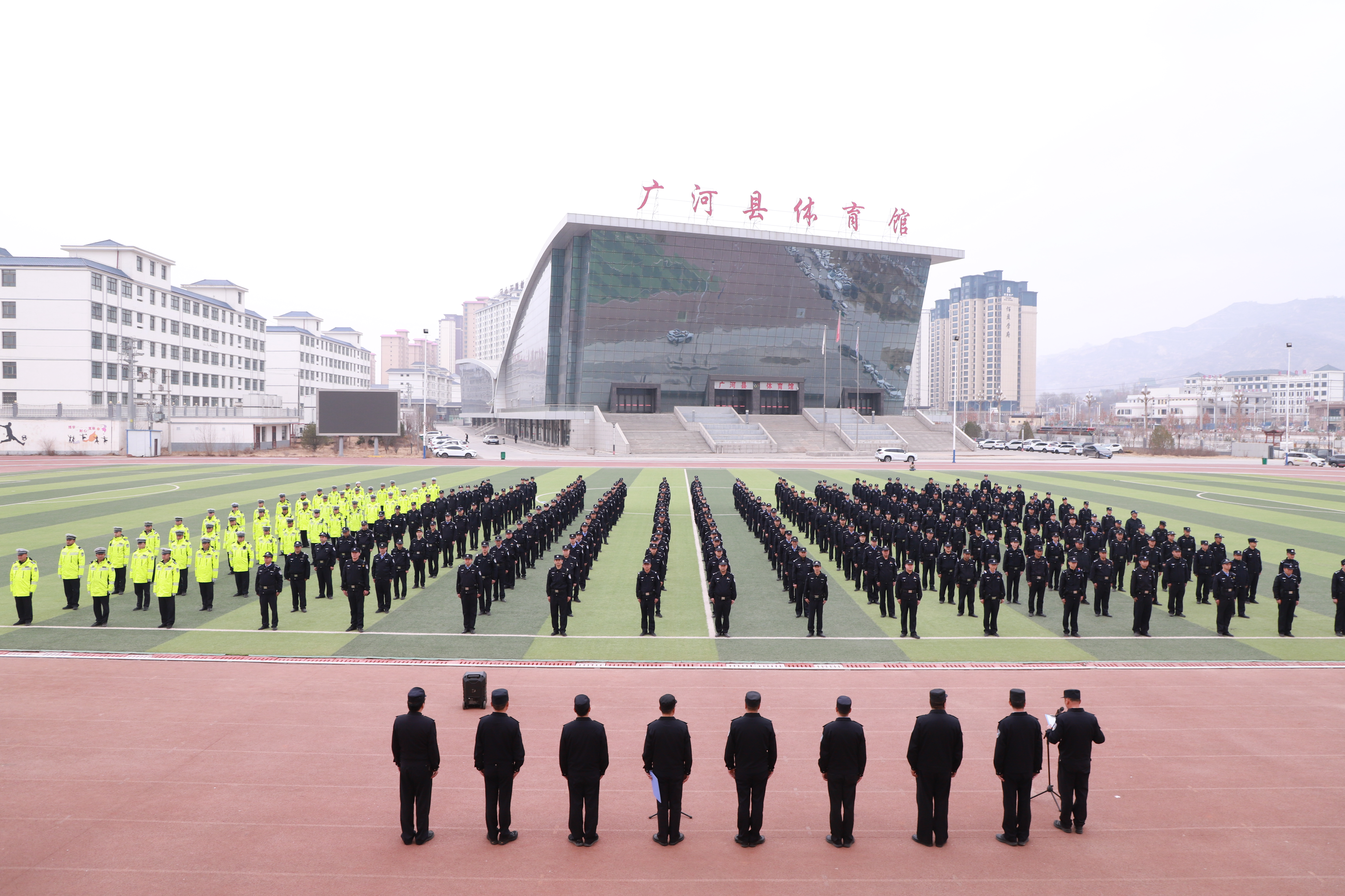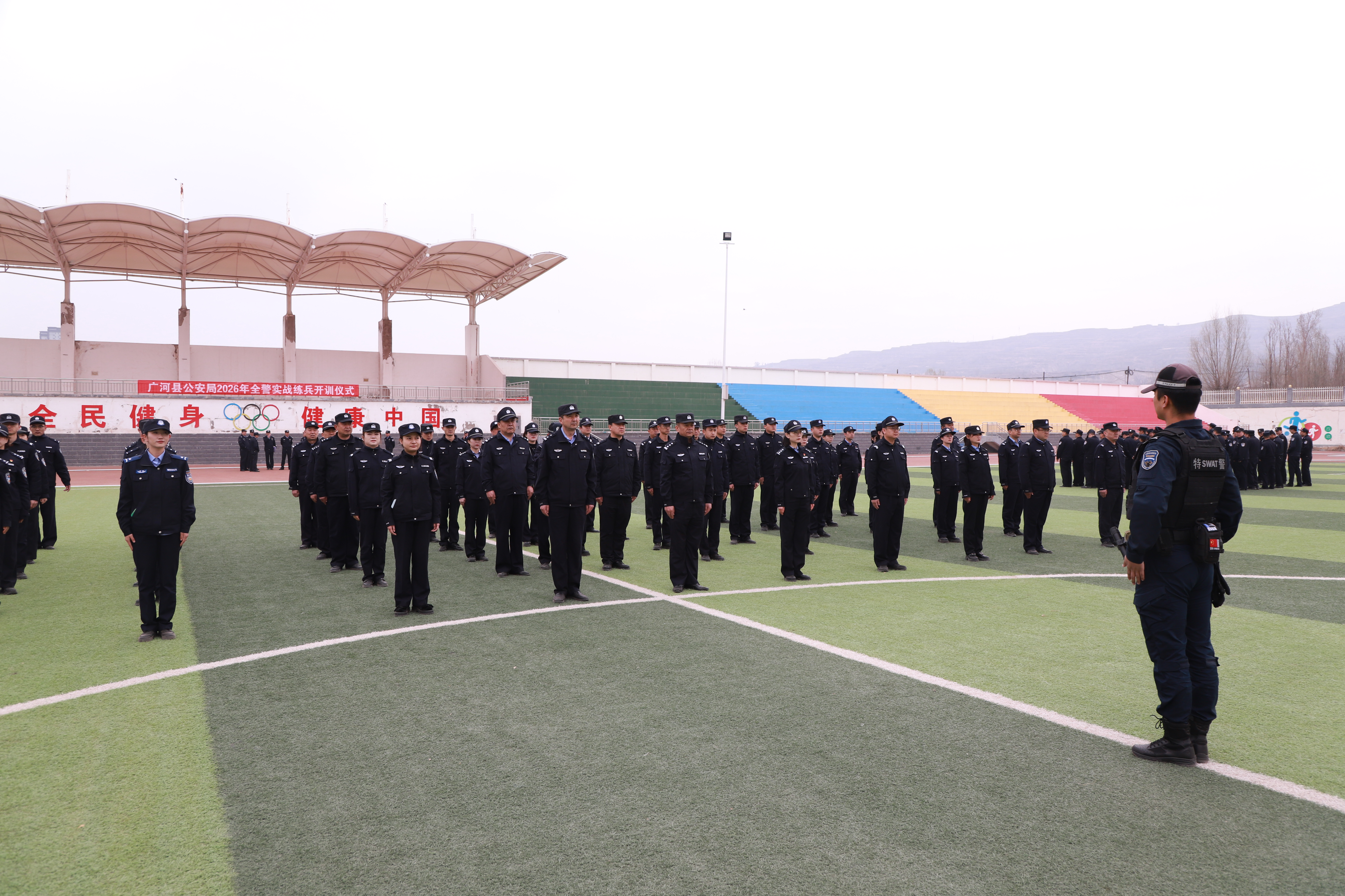 仪式在嘹亮的《中国人民警察警歌》声中正式拉开帷幕。现场宣读《广河县公安局2026年度实战练兵方案》,本年度练兵以省厅“实战应用年”为主题,聚焦新质战斗力提升,将围绕“五项练兵行动”展开,涵盖综合体能、队列礼仪、交通指挥手势、警务技能等训练内容,并对参训范围、组训方式及训练纪律提出了明确要求。