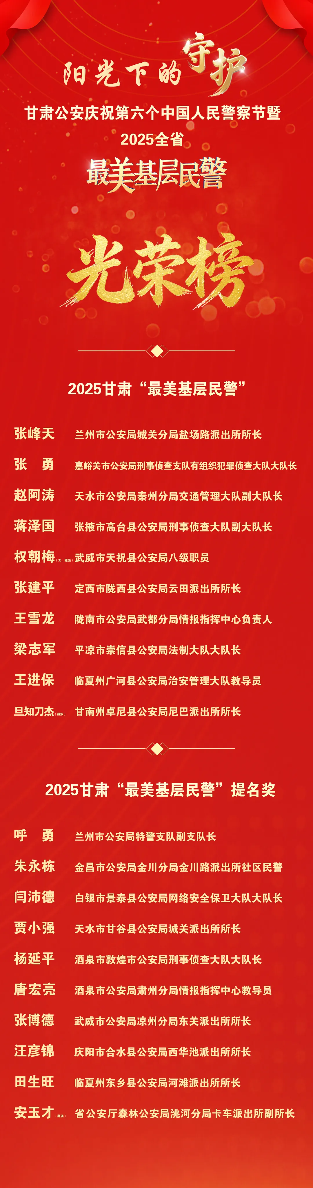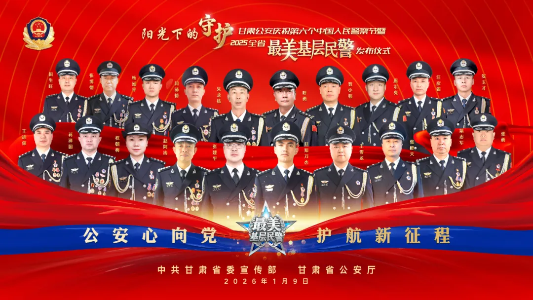 1月9日下午,省委宣传部、省公安厅在兰州举行“阳光下的守护”甘肃公安庆祝第六个中国人民警察节暨2025全省“最美基层民警”发布仪式。经过层层推荐、严格评审、逐级筛选,全省公安机关10人当选2025甘肃“最美基层民警”,10人荣获提名奖。其中,广河县公安局治安管理大队教导员王进保当选2025甘肃“最美基层民警”。